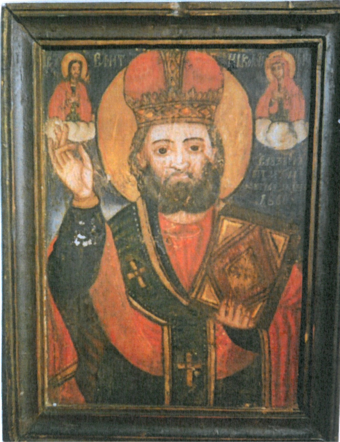 Sfântul Ierarh Nicolae (Fig. 6, 67x51 cm, ramă de lemn în relief lată de 6 cm, de culoare maro închis, prinsă cu cuie de lemn) este reprezentat bust, în poziție frontală, îmbrăcat cu veșminte roșii și verzi. Pe cap poartă o mitră de culoare roșie, în forma unei coroane imperiale. Sfântul binecuvintează cu mâna dreaptă, iar în mâna stângă ține Sfânta Evanghelie închisă. Sus, în partea stângă, este înfățișat Mântuitorul, iar în partea dreaptă Maica Domnului, în veșminte roșii pe nori albi. Sub imaginea Maicii Domnului este inscripționat cu alb pe fondul albastru închis, cu litere chirilice, următorul text: “S-au zugrăvit de Toma zugrav în Laz. 1860”.